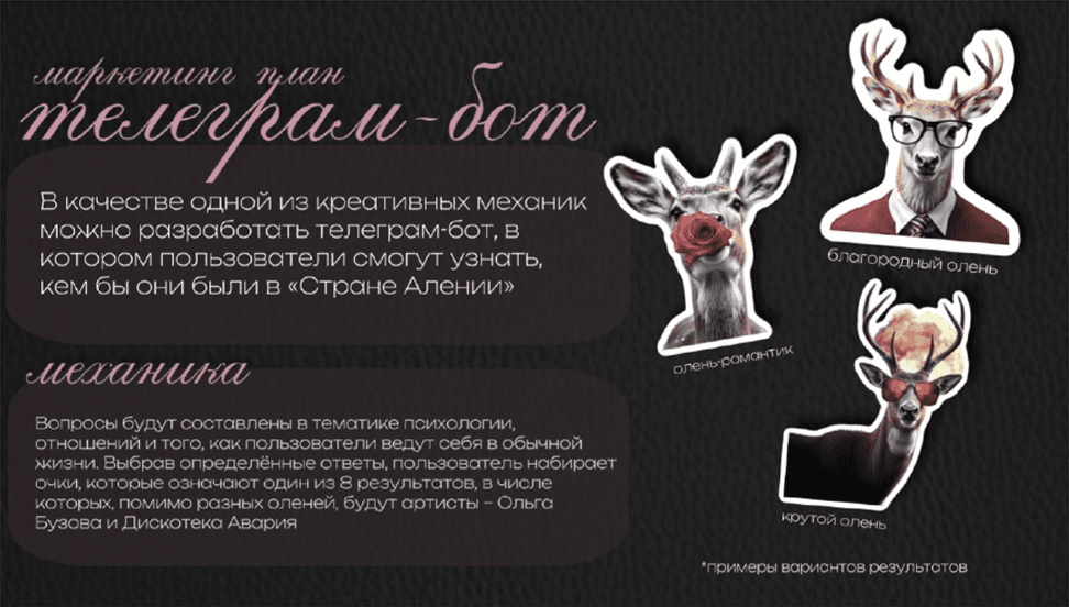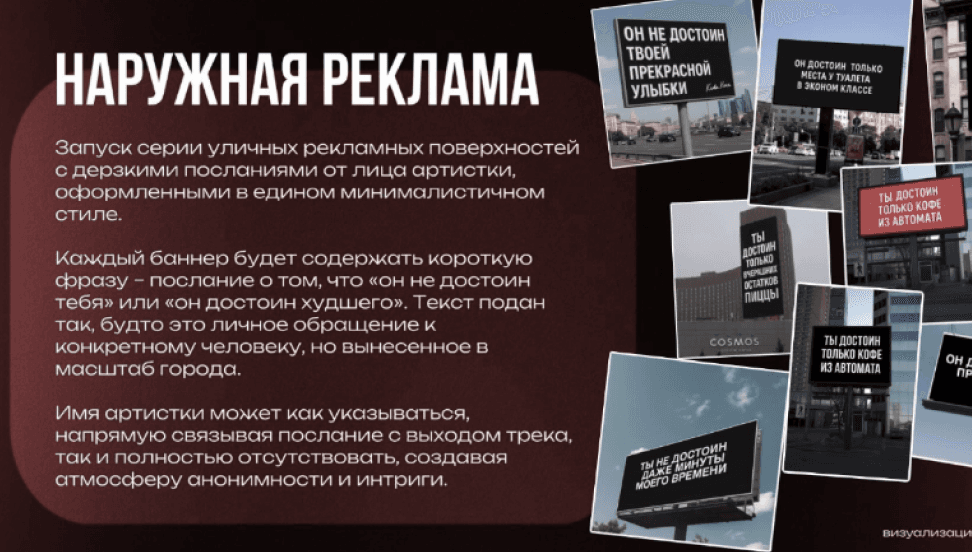 После брифинга вы получите полноценное предложение под вашу задачу: несколько вариантов идей, описание инструментов, примеры визуализации и первичный медиаплан.